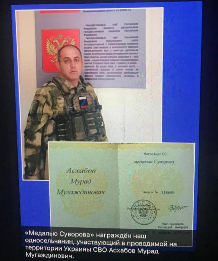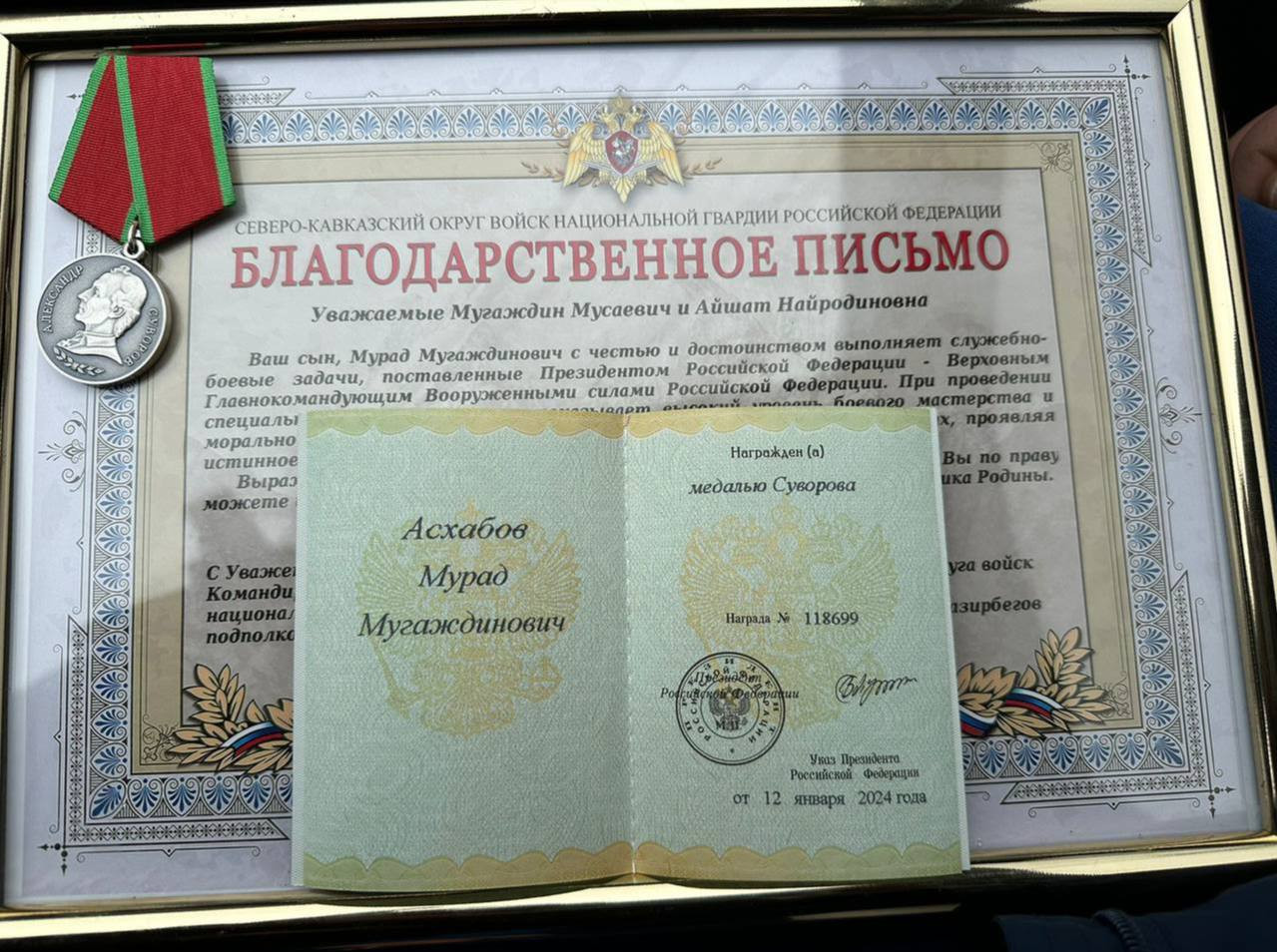 Асхабов М. М. награжден медалью Суворова, участвующий в проводимой на территории Украины СВО. Он с честью и достоинством выполняет служебно-боевые задачи, поставленные президентом РФ – Верховным Главнокомандующим Вооружённых сил РФ. При проведении СВО, показывал высокий уровень боевого мастерства и моральной выдержки, он профессионально действует в сложных ситуациях, проявляя истинное мужество и героизм.